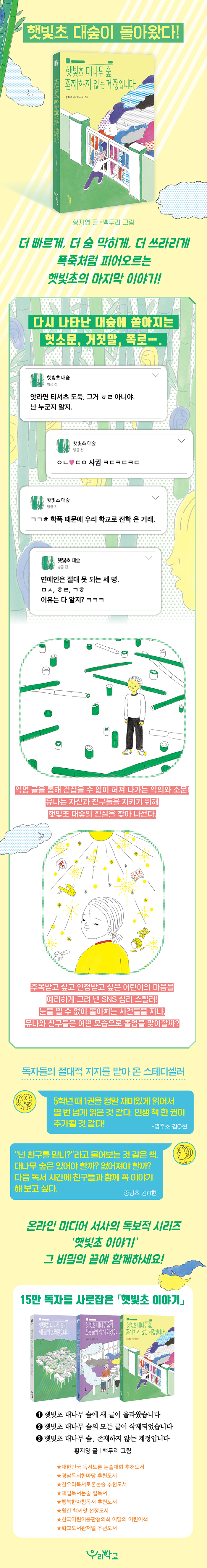 다시 대숲 계정을 연 사람은 대체 누구일까? 숨기고 싶었던 건희의 과거를 폭로하는 사람은 또 누구일까? 다른 사람의 악의에 상처 입고, 소문에 휩쓸리고, 쓰라린 잘못을 후회하며 힘껏 성장하는 햇빛초 아이들과 함께, 독자들 역시 더 단단한 마음으로 어린이 시기로부터의 졸업과 새로운 시작을 향해 나아가게 될 것이다.