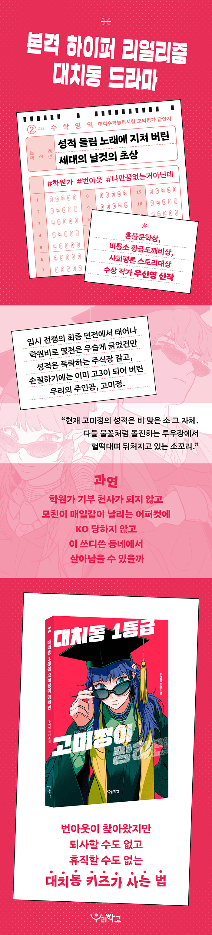 학원비로 몇백만 원은 우습게 쓰면서 밥은 편의점이나 패스트푸드점에서 먹는 아이들, 전화와 문자만 가능한 핸드폰을 들고 다니며 가출을 해도 스카로 하는 아이들이 있는 곳, 대치동. 입시 전쟁의 최종 던전에서 우리의 주인공 ‘고미정’은 학원가 기부 천사가 되지 않고, 모친이 매일같이 날리는 어퍼컷에 KO 당하지 않고, 이 쓰디쓴 동네에서 살아남을 수 있을까?