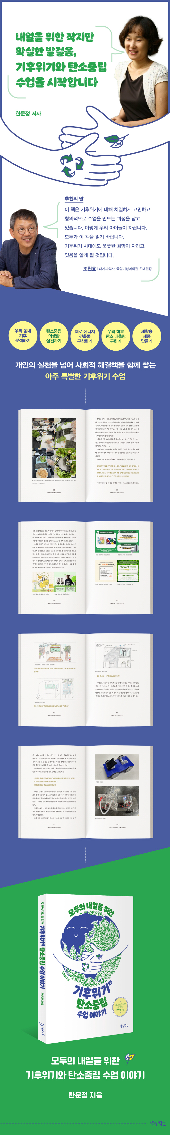 기존의 기후위기 수업은 현재의 빠른 탄소중립 논의를 담지 못하고 지속가능한 발전 쪽에 머물러 있거나 개인의 실천만을 강조한 경우가 많았다저자는 개인의 실천도 중요하지만 사회적 해결책을 함께 찾는 수업이 꼭 필요하다고 생각했다이러한 수업은 교사들뿐만 아니라 외부 전문가들과의 협업이 필요하고 학생들의 적극적인 참여가 필수적이다그리하여 저자는 모두가 함께하는모두의 내일을 위한 아주 특별한 기후위기와 탄소중립 수업을 시작한다.