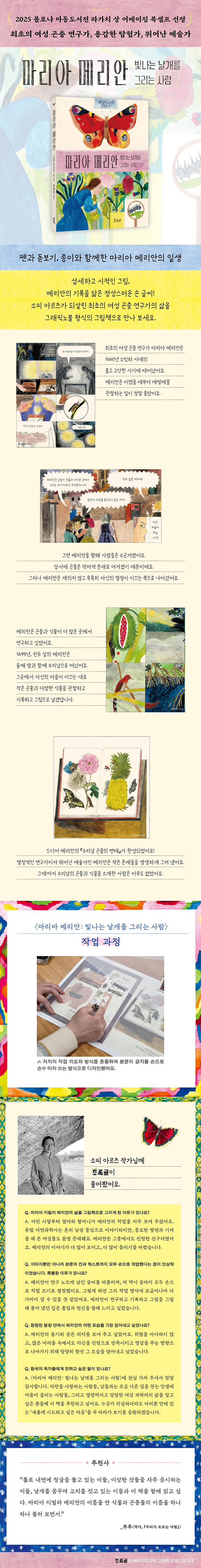 자신만의 길을 찾아가는 어린이‧청소년이라면, 자연과 생명의 세계를 사랑하고 여성 선구자의 이야기가 궁금한 이들이라면, 그림책의 예술성과 서사를 즐거워하는 이들이라면 소피 아르츠가 손끝으로 되살린 마리아 지빌라 메리안의 놀라운 인생 이야기에 주저 없이 매혹될 것이다.