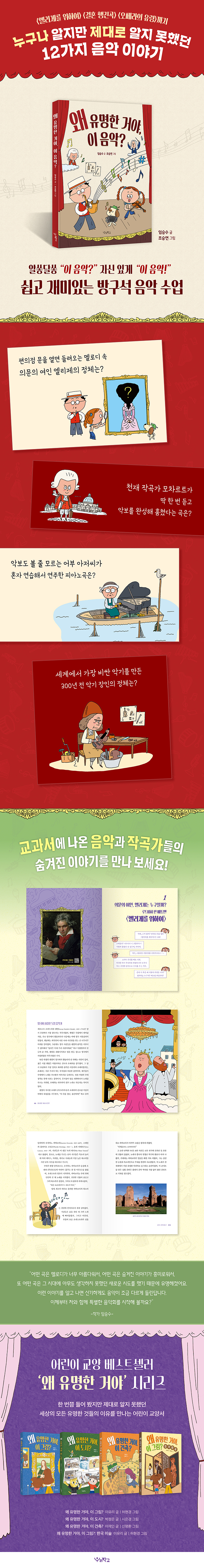 어린이 교양 베스트셀러 ‘왜 유명한 거야’ 시리즈의 『왜 유명한 거야, 이 음악?』은 들으면 알지만 제대로 알지 못했던, 익숙하고 유명한 음악에 얽힌 재미있는 일화와 작곡가들의 생애, 궁금한 악기 이야기를 담았다. 교과서에 나오는 베토벤, 모차르트, 바흐 같은 천재 작곡가들과 대표곡의 숨은 이야기까지! 제목 그대로, 유명한 건 알겠는데 도대체 왜 유명한 거야 싶은 음악의 매력과 감상 포인트, 곡에 얽힌 소문과 오해까지 독자들의 궁금증을 쉽고 재미있게 풀어준다. 책에 실린 열두 편의 음악 이야기를 읽다 보면, 어린이 독자들이 살면서 곁에 두고 오래 즐기고 사랑할 수 있는 소중한 음악 인연도 만나게 될 것이다.